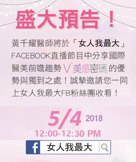 盛大預告:2018/05/04中午12:00~12:30黃千耀醫師將於「女人我最大」FaceBook直播節目中分享國際醫美前瞻趨勢『V美感密碼』的優勢與獨到之處,誠摯邀請您一同收看,謝謝