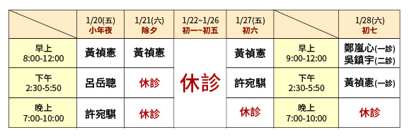 1/27(五)除夕夜早上黃禎憲醫師,黃千耀醫師看診,下午晚上休診。